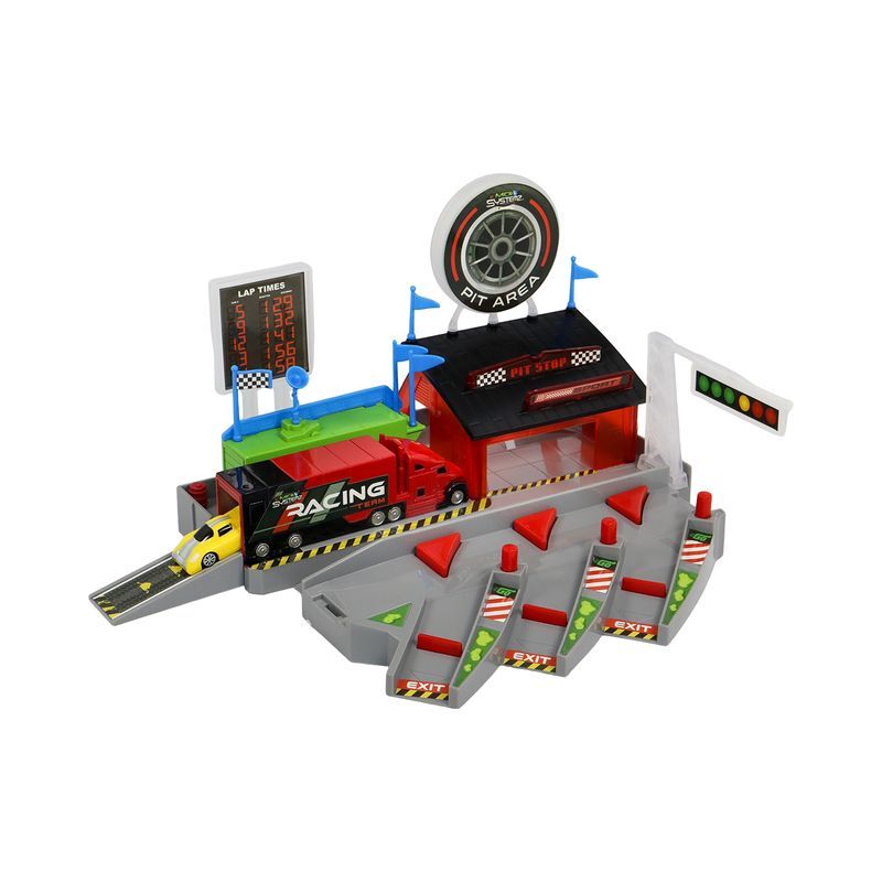 Contenido del paquete: Playset de boxes con múltiples accesorios y vehículos en miniatura